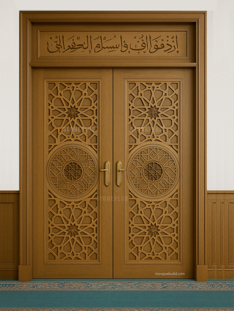Each door features a blend of premium materials such as solid oak, tempered glass, or brushed aluminum, and showcases modern interpretations of Islamic geometric patterns and Quranic calligraphy. Minimalist in structure yet rich in meaning, these doors serve as powerful entryways into spaces of worship, reflection, and unity.